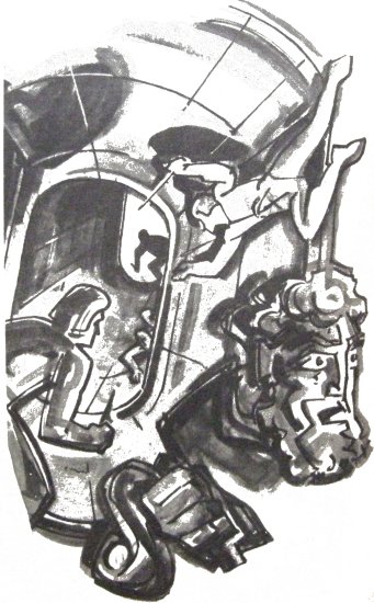 Хью лишь мельком увидел нож, воткнутый в лицо. Потом он услышал, как повернулся рычаг. Джим встретил атакующих лицом к лицу. Оттолкнувшись от переборки непривычно отяжелевшими ногами, он ринулся на врагов, сжав обеими руками свой страшный, в руку длиной клинок. Ножи противника сыпались на него, отскакивая от стальных доспехов. Он крутанул клинком и рассек одного стражника почти надвое.