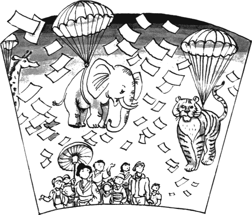 А самолёт сбросил вниз разноцветные листочки. Красные, зелёные, голубые, фиолетовые листки закружились над землёй.