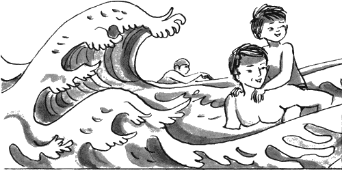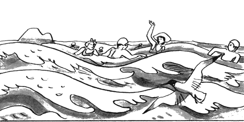 Берег, который показал мне папа, был очень красивый. И я сразу узнал маму в толпе людей. Будто она стоит в центре мира, а вокруг цветы. Люди в разноцветных купальниках были такие нарядные. И вообще всё было удивительно.