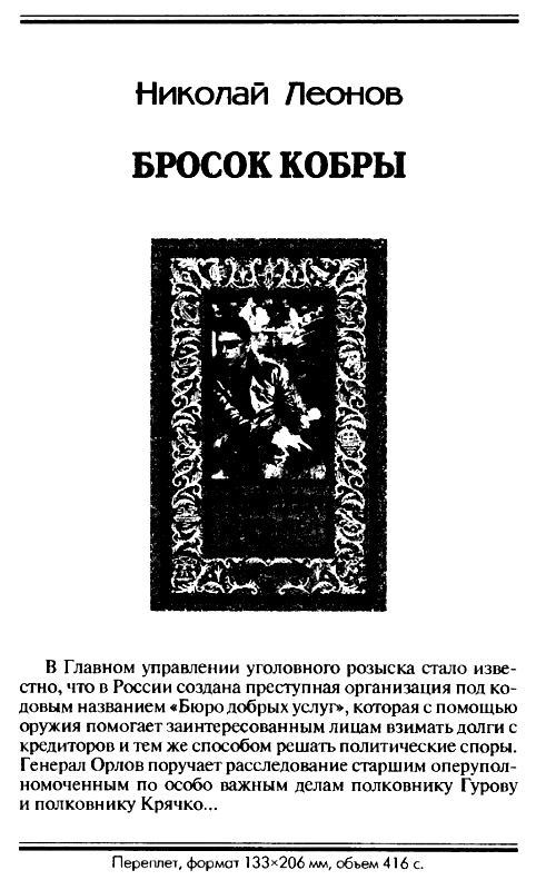 — Не ерничай, — остановил полковника Орлов. — Дураки живут в соседнем подъезде. Обвинение серьезное, мол, Гуров подписал контракт по оказанию помощи в организации охраны некоторых финансовых структур. Полковники Гуров и Крячко, выполняя левый заказ, взяли в министерстве командировку и за счет налогоплательщиков устраивали свои личные дела.