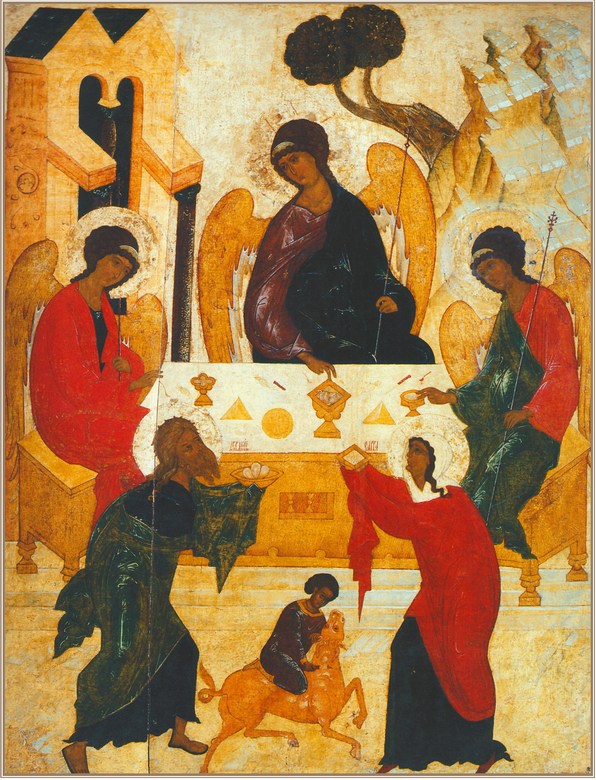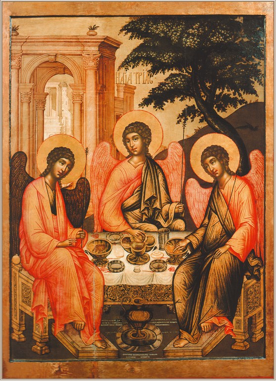 В частности, иконописец посредством своей кисти или сообщает чадам Св. Церкви те понятия о Всевышнем Существе, которые сам Бог открыл нам о себе в Св. Писании, или изображает бесплотных духов и людей, благоугодивших Богу своею верою и добродетелями. Древнейшим символом Бога во Всесвятой Троице, поклоняемого в откровении и в области иконописания, можно почесть явление Господа Аврааму в виде трех мужей, которым он оказал гостеприимство, приняв их как странников.