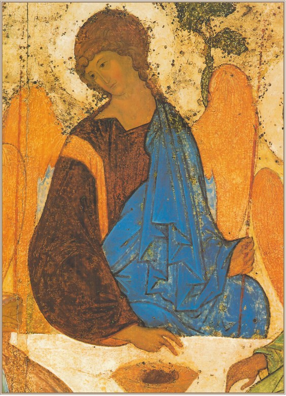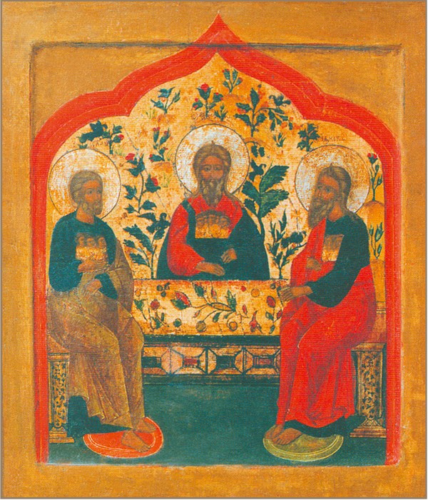 12 Известно, что икона Св. Троицы Рублева тем отличается от сродных икон этого типа, что в ней устранены фигуры Авраама и Сарры, принимающих и угощающих трапезой своих неведомых посетителей. Таким образом, то, что было скорее изображением одного эпизода из ветхозаветной истории, у преп. Андрея стало открытой и дерзновенной иконой Пресв. Троицы. На этом примере, может быть, всего нагляднее можно увидать, каким образом иконописец, считаясь с традицией, в то же время ее творчески изменяет, а тем самым он своим творчеством влагается в церковное предание. То, что изначала могло явиться смелым новшеством, для нас сейчас является уже каноном, правильное отношение к которому сам преп. Андрей установляет своим собственным примером, впрочем, не единственным. Археологический очерк об иконах Св. Троицы см. в издании Seminarium Condacovianum [II]: Н. Малицкий. К истории композиции Ветхозаветной Троицы. Прага, 1928.