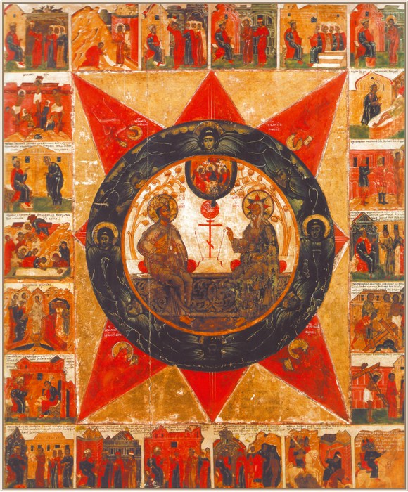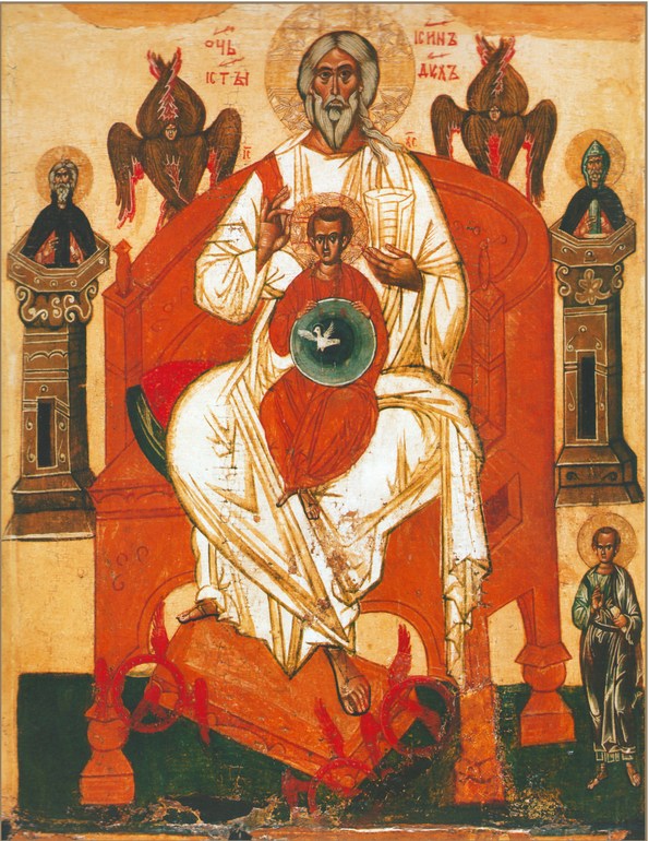 Но как Пророку Даниилу Отец Небесный явил Себя в образе ветхого деньми в одежде снеговидной, Второе лице ради нашего спасения вочеловечилось, а Третие лице Св. Троицы являлось в виде голубином и огненных языков, то вошло в обычай и в таких образах посредством иконописного художества представлять понятие о Всесвятом существе Божием, в Троице Святой прославляемом.