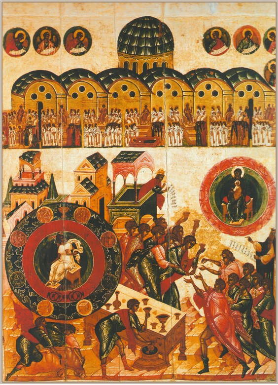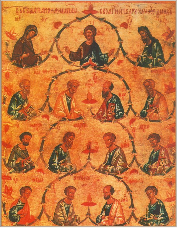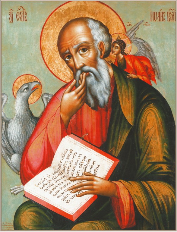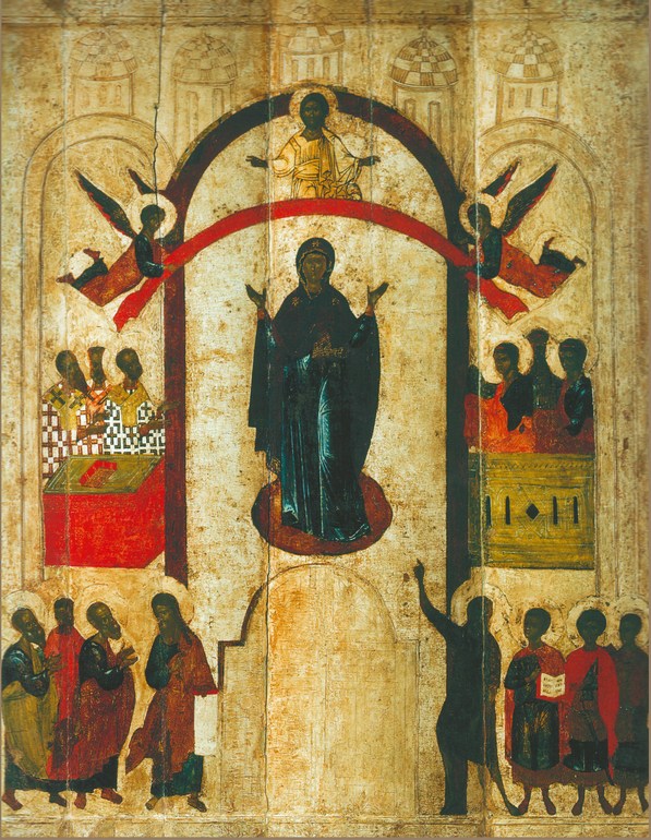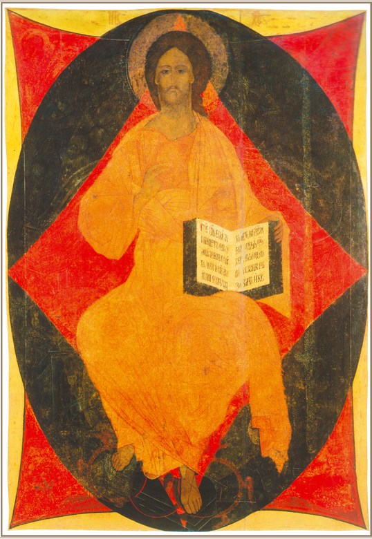 По-видимому, знаменитое новгородское изображение «Софии» представляет собой как бы иконописный комментарий к началу первой главы Евангелия Иоанна. Слова «В начале было слово» изображаются Евангелием на престоле; образ Христа, непосредственно под Евангелием, очевидно, напоминает слова: «И Слово было Бог». «София» в иконе ставится в непосредственное отношение к Слову, через которое все произошло. А ночная тьма прямо намекает на слова: «и свет во тьме светит, и тьма не объяла его». Этим объясняется и присутствие в иконе Богоматери и Иоанна Предтечи – двух свидетелей Слова.
