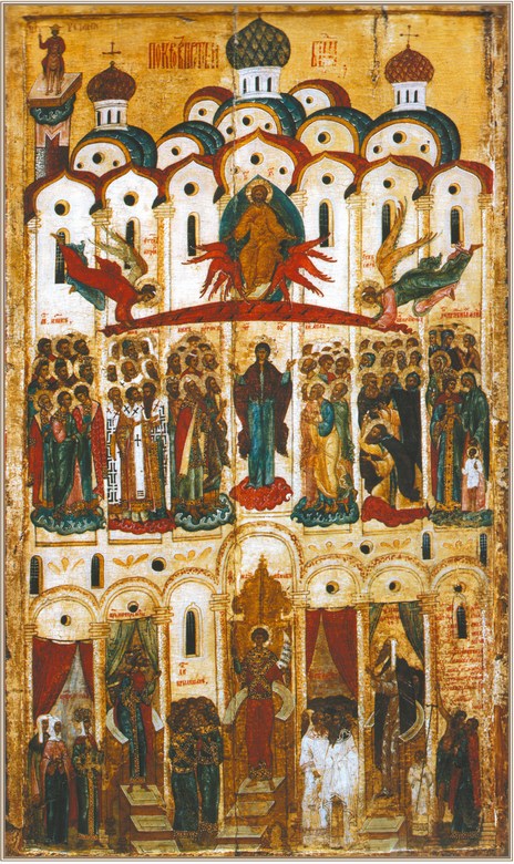 Ибо честь «воздаваемая образу, преходит к первообразу, и покланяющиеся иконе покланяются существу изображенного на ней»14. Сообразно с сим и на Соборе, состоявшемся в Москве 1667 года, на коем кроме Московского, присутствовали Патриархи Паисий Александрийский и Макарий Антиохийский, положено: «еже призрети оком благоразсмотрения на писание честных и Святых икон и на иконописатели, да оныя лепо, честно, со достойным украшением искусным разсмотром художества пишемы будут, воеже бы всякаго возраста верным, благовейная очеса си на ня возводящим к сокрушению сердца, ко слезам покаяния, к любви Божий и Святых его угодников, и подражанию житию их Богоугодному возбуждатися, и предстояще им мнети бы на небеси стояти себе пред лицы самых первообразных»15. <…>