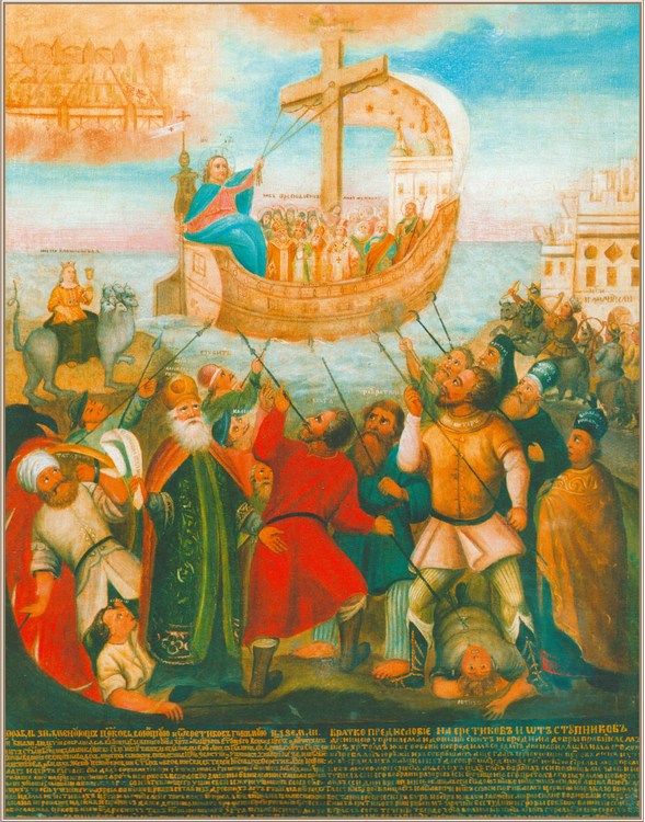 20 Совокупность таких несообразностей и исторических неверностей можно усматривать в книге «Живописный Карамзин». На всех картинах этой книги, на которых художнику довелось представить монахов нашей Церкви со введения в нашем отечестве Христианства и до XVIII столетия, он изобразил их в камилавках и клобуках современной нашему веку формы и сверх того украсил их крестами, наподобие митрополичьих. На картине, представляющей крещение великой княгини Ольги, константинопольский Патриарх и особенно его прислужники изображены в новейших облачениях Римской Церкви, а св. Ольга поставлена в крестильне, устроенной наподобие вазы, столь малой, что и над младенцем невозможно было бы в таком сосуде совершить крещения не только по обряду Восточной Церкви через погружение, но и по обряду Римской Церкви через излияние воды на крещаемого.