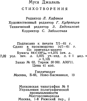 Верный сын советского народа, поэт-коммунист Муса Джалиль «умер, побеждая», отдал свою честную, светлую жизнь борьбе за отчизну, за счастье народа. Его богатое поэтическое наследие вошло в золотой фонд многонациональной советской литературы. Оно не тускнеет с годами, сила поэзии М. Джалиля возрастает с каждым годом, вдохновляя и зовя народы к борьбе, к светлому будущему.