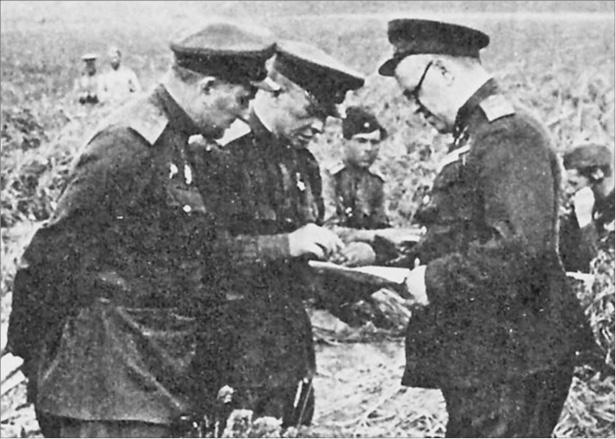 Генерал-майор А.И. Родимцев командир 32-го гв. стр. корпуса докладывает обстановку представителю Ставки маршалу Г.К. Жукову (на фото справа) и командующему 5-й гв. армии генерал-лейтенанту А.С. Жадову, Курская дуга, 1943 г.