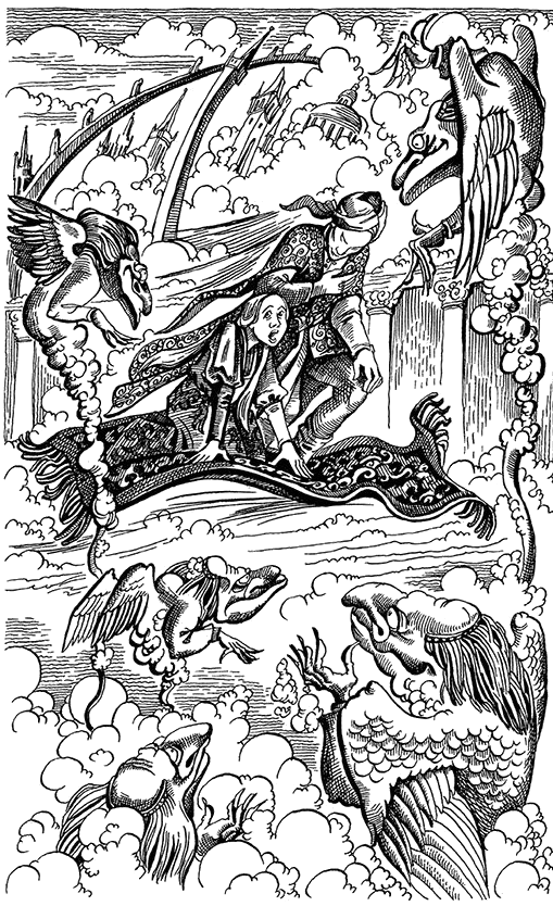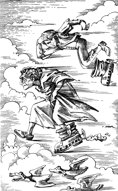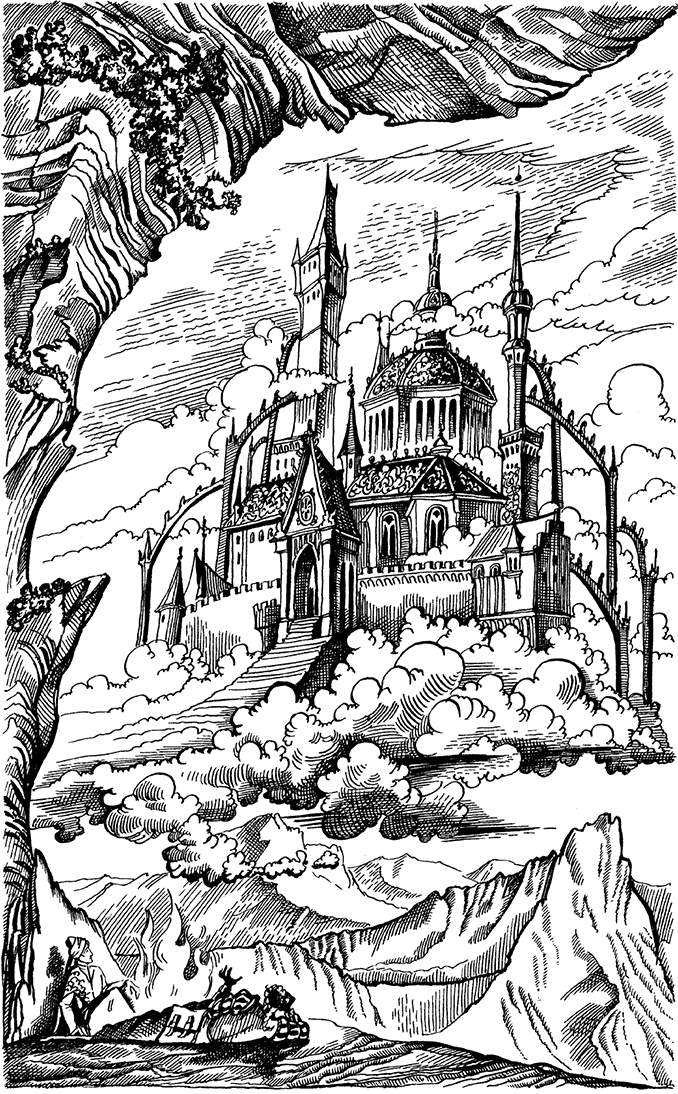К этому времени на Королевской площади собралась поглазеть на замок половина населения Верхней Норландии. Все они в полном изумлении смотрели, как замок слегка приподнялся в воздух и заскользил к дороге, ведущей на юг. Вообще-то эта дорога была едва ли шире переулка. «Не пролезет!» — говорили в толпе. Однако замок сумел поджать бока, проплыл по дороге и скрылся из виду.