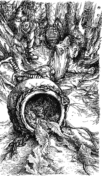 Стены содрогнулись, отчего Кальцифер выскочил из камина и завис над головой у Чармейн. Затем в стене рядом с камином медленно-медленно разверзлась огромная дыра. Сначала отслоились обои, затем осыпалась и исчезла штукатурка — и наконец не осталось ничего, кроме черной пустоты. Из дыры спиной вперед вылетел Питер и повалился навзничь прямо перед Чармейн.