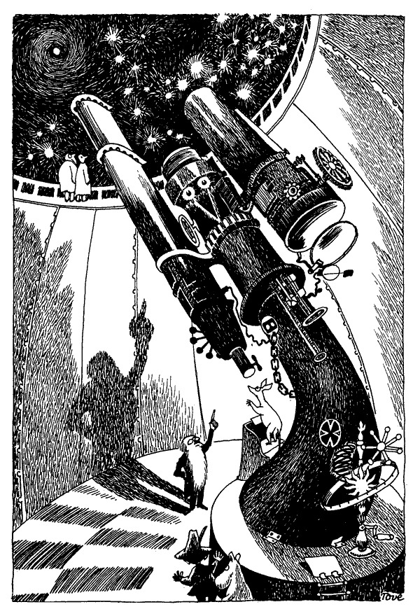 Все просыпались и, волнуясь, вылезали из грота. Один только Хемуль даже не удивился, что Земля по-прежнему жива и цела. Он вытащил на берег свой альбом, чтобы разложить всё как следует, и на всякий случай придавил его по углам тяжёлыми метеоритами.