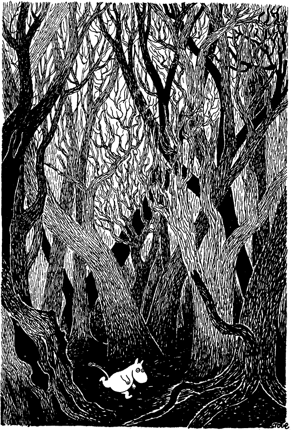 С бьющимся сердцем он углублялся в лес и думал, какие гадкие эти остальные. Прячутся сейчас в его гроте и едят свой противный торт. А он, Снифф, один в целом свете не прячется, хоть ему и страшно. Но наплевать ему на них. Никто и ничто его больше не волнует. Даже кометы. Даже кисоньки.