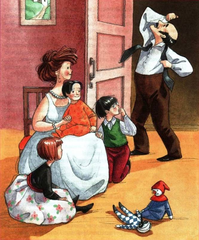 Миссис Дарлинг решила посоветоваться с мистером Дарлингом. Но он только снисходительно улыбнулся.