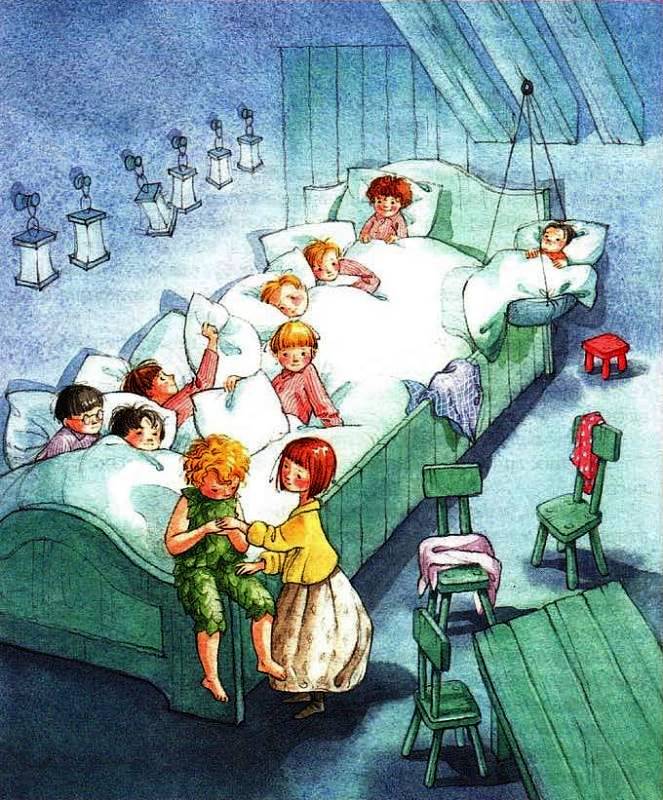 Ребята уже улеглись спать. У Нэны был выходной, и миссис Дарлинг сама их выкупала, и уложила в постель, и спела песенку каждому. Пока они один за другим не отправились в страну сновидений.