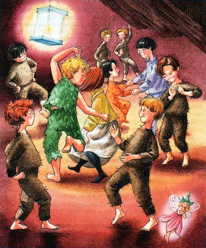 Порой в детской открывались танцы. Иногда в них принимала участие и Лиза, единственная прислуга в доме. Ох, как бывало весело! Веселее всех отплясывала сама миссис Дарлинг. Она так приседала и кружилась, что видна была только та самая улыбка. Если бы в тот момент с маху наскочить на миссис Дарлинг, может быть, и удалось бы наконец эту улыбку поймать. Трудно было представить себе более простую и счастливую семью до того, как появился Питер Пэн.
