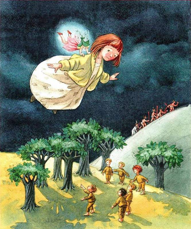 Конечно, в конце концов Венди их отпустила. Мы видим ее возле окна, она глядит им вслед, как они поднимаются в небо и делаются маленькими, как звезды.