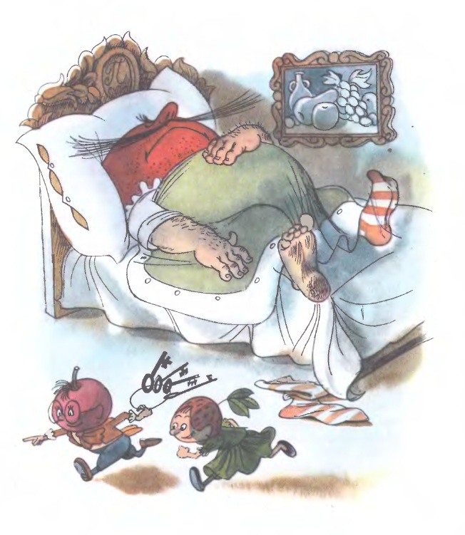 Я бы с удовольствием позволил ему захлебнуться слезами или кубарем скатиться с лестницы от первого толчка, но Чиполлино был так великодушен, что пощадил его, и перепуганный насмерть синьор Помидор сам удрал с башни. Он бежал вниз по лестнице, перескакивая не через четыре, а через шесть ступенек, и, добравшись донизу, юркнул в свою комнату, где ему никто не помешает поплакать вволю.