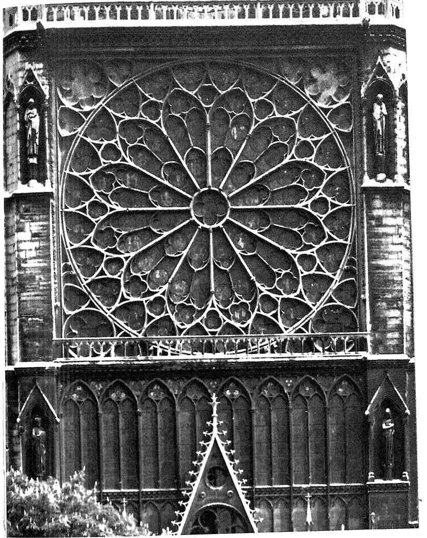 Указанная концепция — ключ к пониманию нового искусства, ей соответствует архитектура готического храма, в котором свет придает единство внутреннему пространству. Сама готическая конструктивная система и была направлена на создание слитного, пронизанного светом пространства. Сугерий предпринял перестройку фасада монастырской церкви Сен-Дени. «Свет заходящего солнца проникал внутрь через окна трех порталов. Над ними сияла роза — первая, появившаяся в западной части церкви и освещавшая три верхние часовни в честь небесных иерархов — Девы Марии, архангела Михаила и ангельского воинства. Основной элемент фасада всех будущих соборов возник благодаря богословским рассуждениям Сугерия. <...> На противоположном конце церкви, там, где, повторяя движение восходящего солнца, завершалось литургическое шествие, Сугерий устроил источник света, место, где становилось возможным в ослепительном сиянии приблизиться к Господу. Было решено убрать стены, и строителям пришлось для этого использовать все архитектонические возможности того приема, который до сих пор применялся в зодчестве лишь для украшения, — речь идет о пересечении стрельчатых арок. <...> Романские образцы предлагали план галереи церковных хоров, от которой во все стороны отходили ответвления-ниши. Сугерий приложил все силы, чтобы сделать эти ниши как можно более открытыми дневному свету. Изменив строение сводов, он добился появления дополнительных окон, заменил стены-перегородки колоннами и воплотил свою мечту — придал стройность богослужению, подчинив освещение храма особой логике. Все участвующие в службе будут теперь собраны вместе, организованы в единое целое самой формой полукружия и еще более того — объединяющим всех светом». И т. д., и т. п. — пусть лучше читатель обратится к тексту самого профессора Дюби.