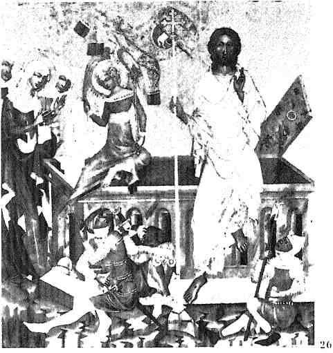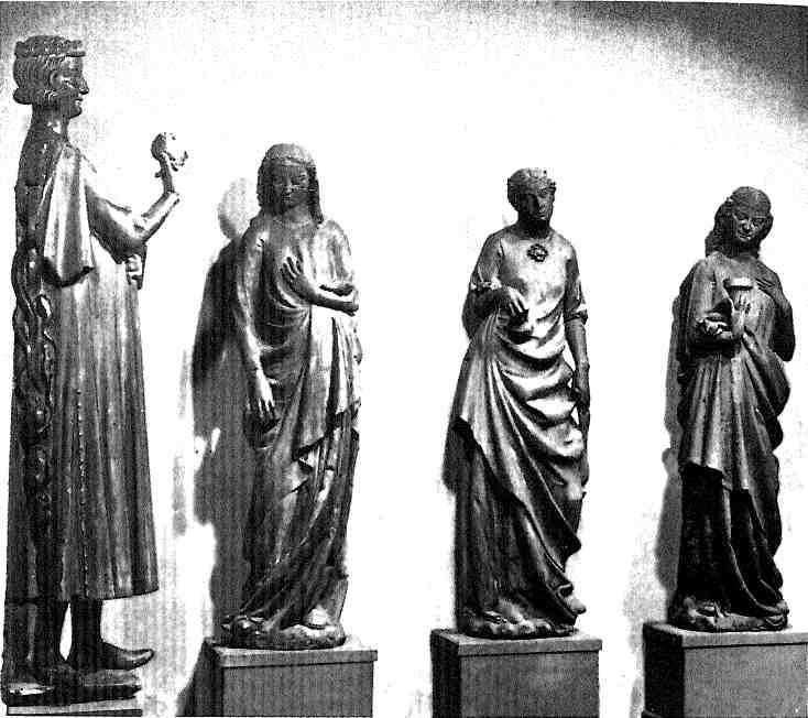 Искусство следует за мыслью новых богословов из нищенствующих орденов. Оно изображает Христа, апостолов, святых как реальных людей, но людей просветленных, перешедших в иной мир, мир света. «В то время мысль учителей воинствующей Церкви не останавливалась на Страстной пятнице, а сразу обращалась к торжеству Пасхи. В Реймсе, на внутренней стороне портала, украшенного витражами, пропускавшими лучи божественного света, дикие заросли и виноградники окружают фигуры сцены Воскресения, переставшие быть символами и ставшие персонажами. Но это еще и не действующие лица драмы. Эти скульптуры должны были олицетворять духовные добродетели, символом которых стала Голгофа. Изваяния символизировали евхаристические аналогии. Христианство XIII века более, чем когда-либо, было искусством церковным и обращало силу священства против еретиков. Готическое искусство было создано духовенством. Реймсские статуи изображают причастие, высшее таинство, поднимавшее священников, совершавших обряды католического богослужения, над совершенными катаров и проповедниками вальденсов. Скульптурные изображения переносят события смерти Христа в вечную реальность церковных обрядов, в покой. Над их чистым ансамблем, на уровне розы — высшего иконографического достижения 1260 года — галерея царей, предусмотренная первоначально, в последний момент была заменена другой. Это были статуи свидетелей, видевших воскресшего Христа. С высоты, находясь на пике движения вверх, которое возносит к небу все здание собора, они провозглашали, что смерть повержена и что каждый должен радостно славить это чудо. Они говорили о надежде, обретенной искупленным человечеством».