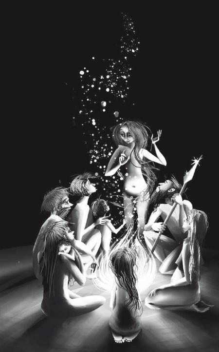 Кто были эти рассказчики? Мы очень мало знаем об устройстве палеолитического и мезолитического общества. Возможно, там и знать-то было особо нечего. Стиль жизни охотников и собирателей предполагает сотрудничество и равноправие. Возможно, от членов группы или племени и требовалась лояльность к своему сообществу, но внутри таких сообществ, скорее всего, царили неформальные отношения. В таком случае успех флейтистов, художников и рассказчиков зависел только от их собственного мастерства. Для сказителей успех должен был складываться из двух частей. Прежде всего, нужно было придумать захватывающую историю, иногда экспромтом. (Впрочем, в наше время лучшие «импровизированные» истории бывают отрепетированы до мельчайших деталей, и не думаю, что в каменном веке было как-то по-другому.) Второй фактор, влияющий на успех, — это талант рассказчика. Вполне возможно, что речь шла не просто о рассказе, но о драматическом, экспрессивном, ритмически выдержанном исполнении истории. Это сейчас речь считают всего лишь каким-то стилистическим приложением к письменности. А тогда речь была в буквальном смысле человеческим голосом, теплым, живым, завораживающим, увлекающим за собой. Аналог бестселлера «Нью-Йорк таймс» в то время представлял собой рассказчицу, у ног которой сидят двадцать жадных слушателей. Не то что парень в соседней хижине — у него всего пять человек, да и те беспокойно ерзают. Понятное дело, что парню ничего не светит; он уже наполовину погрузился в забвение. Пятеро его последователей вскоре присоединятся к аудитории нашей сказительницы, и она станет местной звездой наряду с мальчиком, умеющим находить трюфели, и хозяйкой собаки, которая охотится на оленей.
