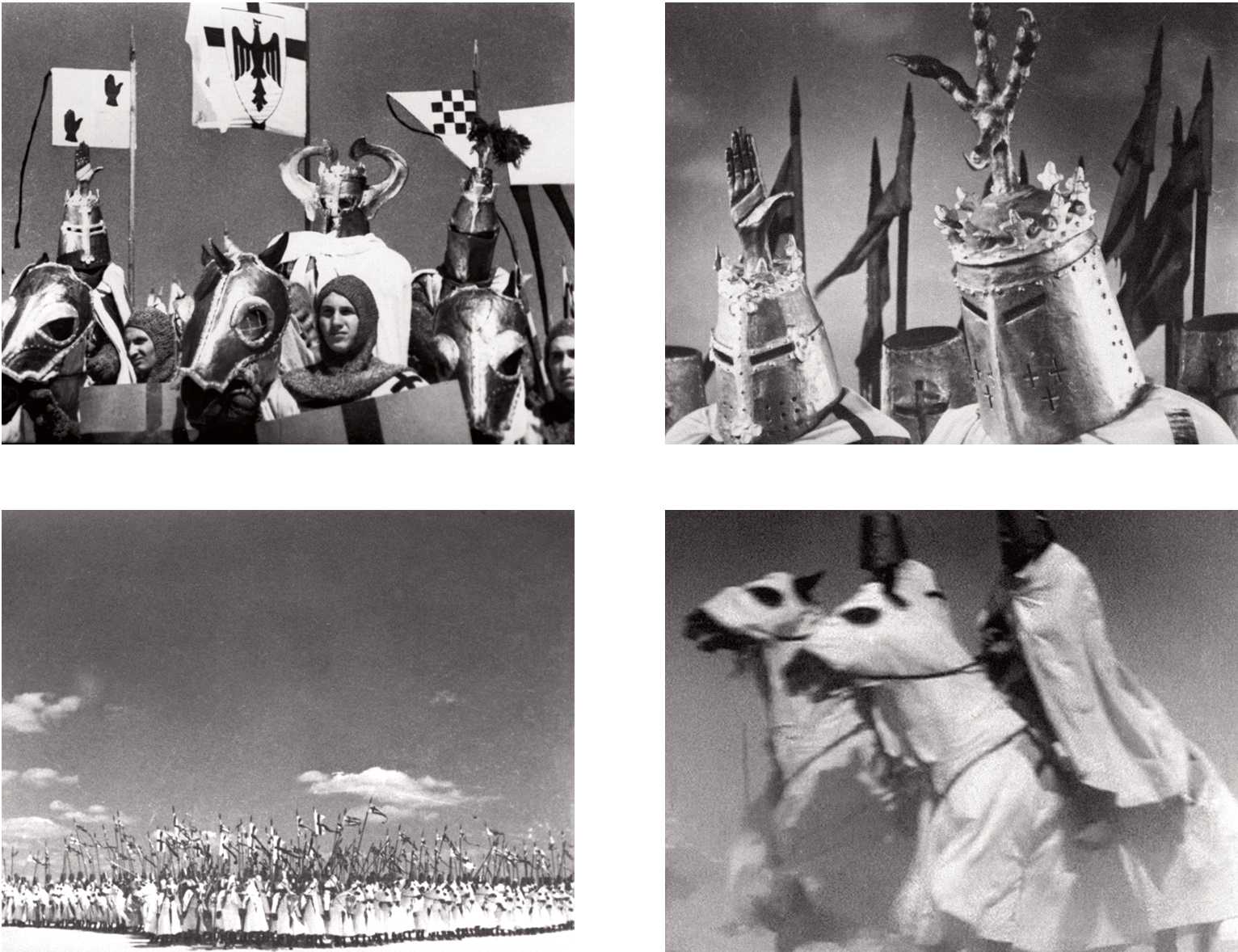 «Кости. Черепа. Выжженные поля. Обгорелые обломки человеческого жилья. Люди, уведенные в далекое рабство. Разоренные города. Попранное человеческое достоинство. Такой встает перед нами страшная картина первых десятилетий XIII века в России»[8]. Текст, который Эйзенштейн написал об «Александре Невском» для сборника об историческом фильме, вышедшем в Москве в январе 1939 года, начинается с этих слов. В этом же тексте Эйзенштейн пишет, что события XIII века близки к событиям нашего времени не буквально, но по своей сути. На самом деле, иногда они настолько близки, что последние новости, кажется, отделяют от истории лишь опечатки: однажды, изучая материалы по русской истории после чтения газетной заметки о бомбардировке Герники, Эйзенштейн наткнулся на описание разрушения крестоносцами в XIII в. города Герсика.