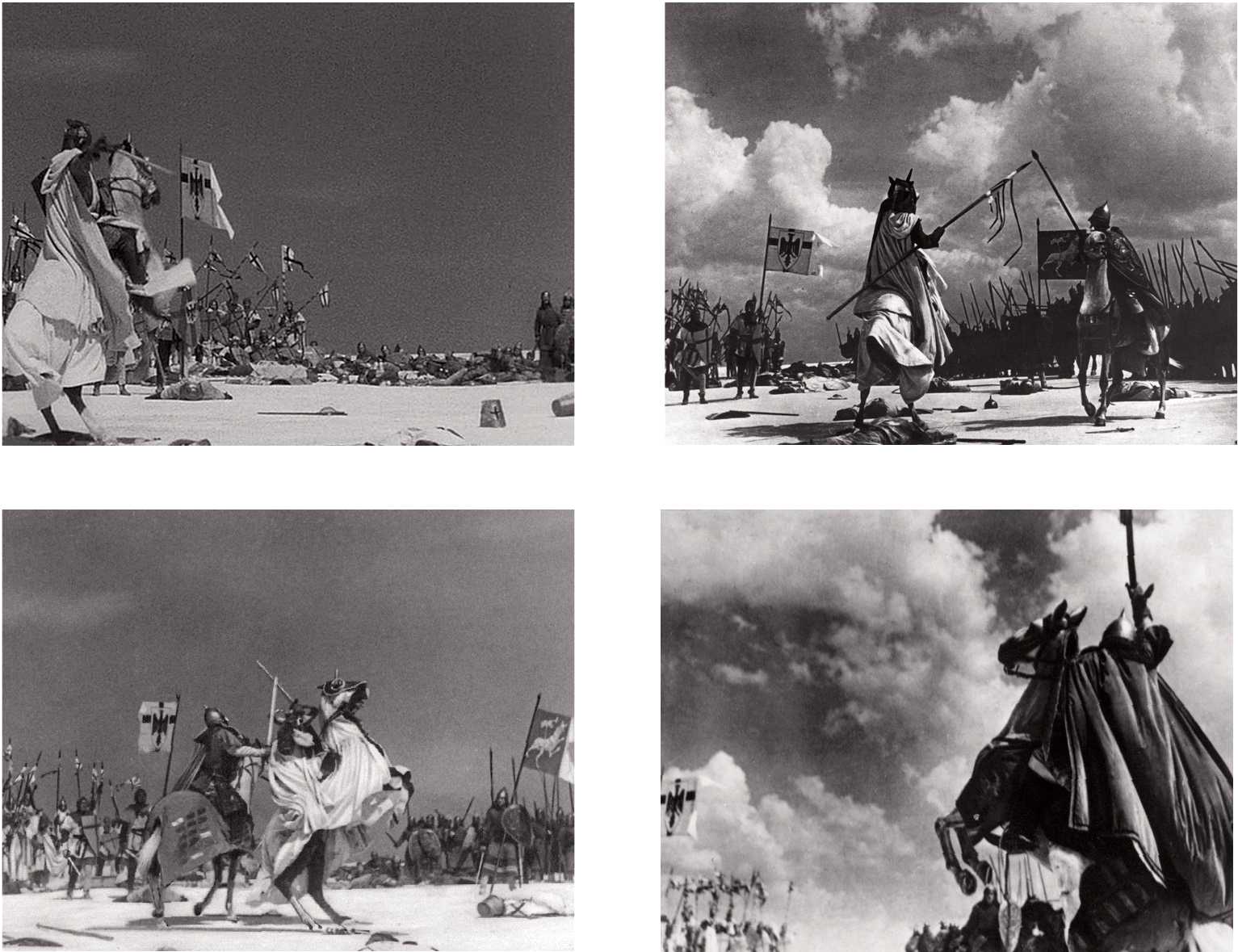 Нечто в конструкции «Александра Невского» напоминает процесс создания живописного произведения. Не только тот факт, что фильм был почти полностью нарисован, до того как был снят, и то, что он разворачивается почти как рисунок, с кадрами, в которых мало движения или ничто не движется, кроме света. Скажем, начальные кадры фильма — это пять пейзажей, в четырех из них доминируют скелеты, непогребенные жертвы давней битвы. Еще одним примером могут служить кадры перед скоком тевтонской конницы в Ледовом побоище: три дальних плана равнины, где линия горизонта прилипла к нижнему краю экрана, а в кадре преобладает небо, заполненное грозовыми облаками, подобно тому небу над Толедо, что было написано Эль Греко. В этом есть что-то от живописи, но не потому, что каждый кадр предъявляет себя зрителю, как если бы это была картина, оставаясь на экране дольше, чем необходимо для того, чтобы опознать снятых людей, объекты и пейзажи. Значение имеют не действия персонажей в каждой сцене или, по крайней мере, не только они. Значение имеет действие изображения в кадре в себе и для себя.