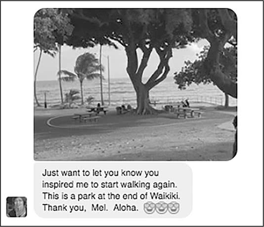 Мел, надеюсь, у тебя все хорошо. Я уже довольно давно собирался тебе написать. Как ты знаешь, я несколько раз тебя слушал, после того как мы разговаривали в последний раз, я нашел твои «посты» и изучал их. Имей в виду, в том что ты делаешь есть смысл. Мы с женой разошлись больше года назад, и это было тяжело. Так тяжело, что я обдумывал самоубийство. Тем не менее, в самый тяжелый момент я отсчитал 5–4–3–2–1, оборвал эту мысль и обратился за помощью. Сейчас у меня все в порядке, жизнь хороша, и я нашел в ней новые цели. Никогда не сомневайся в том, что ты делаешь много хорошего, и это имеет значение. 5–4–3–2–1, вперед! И пусть у тебя будет хороший день! Пока!