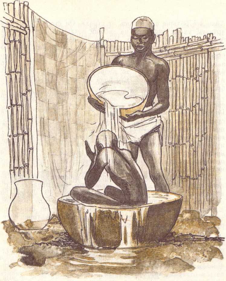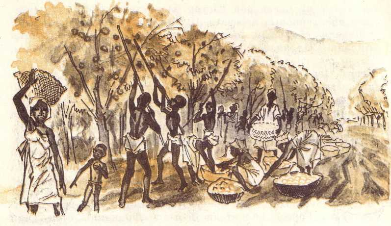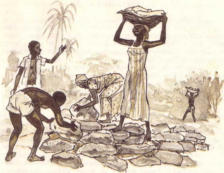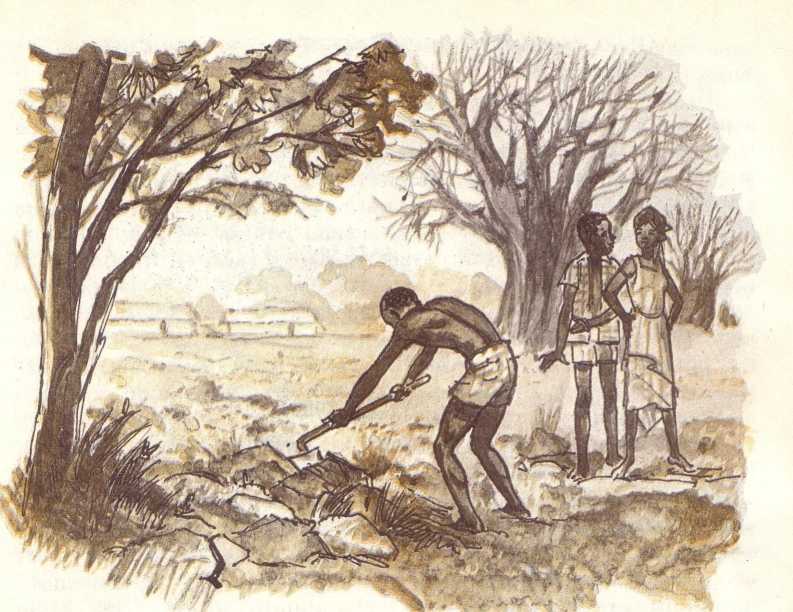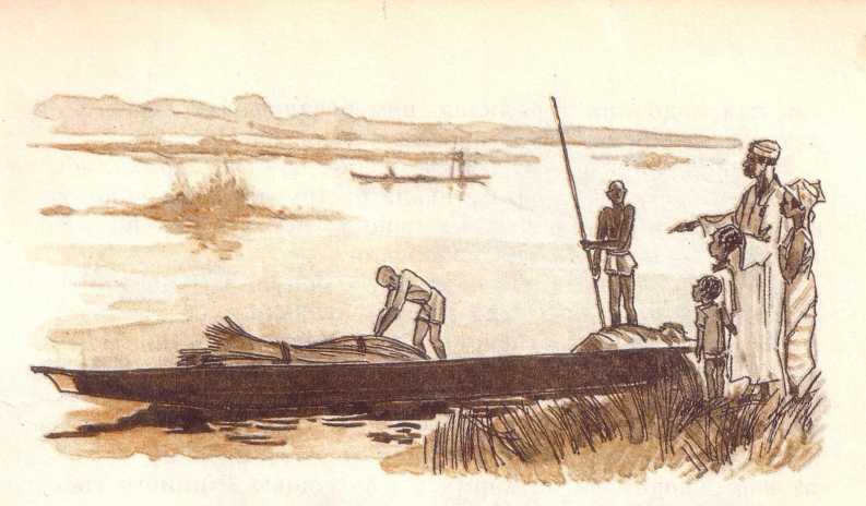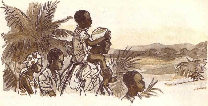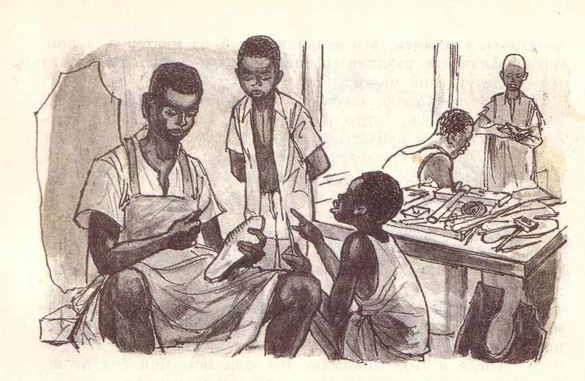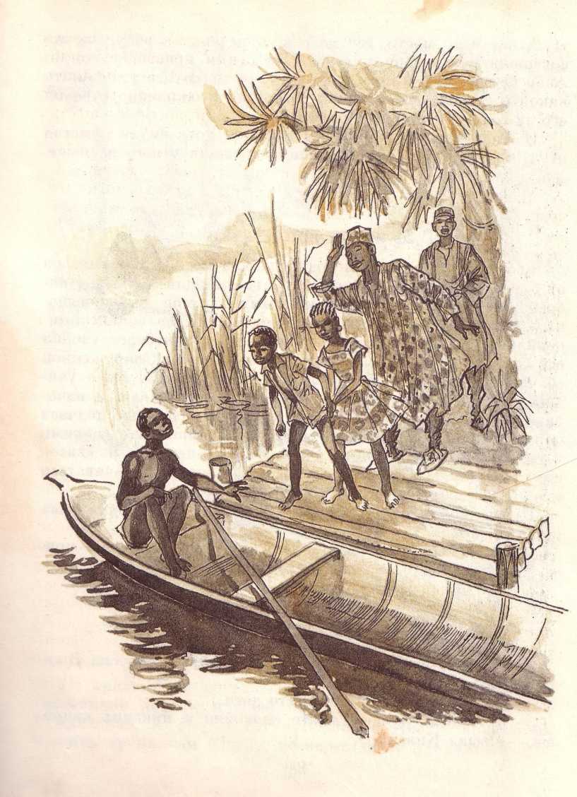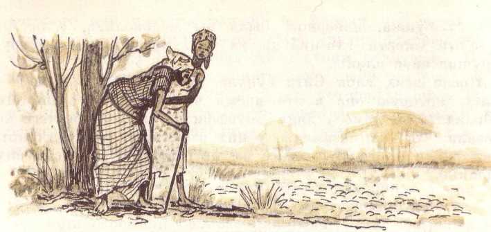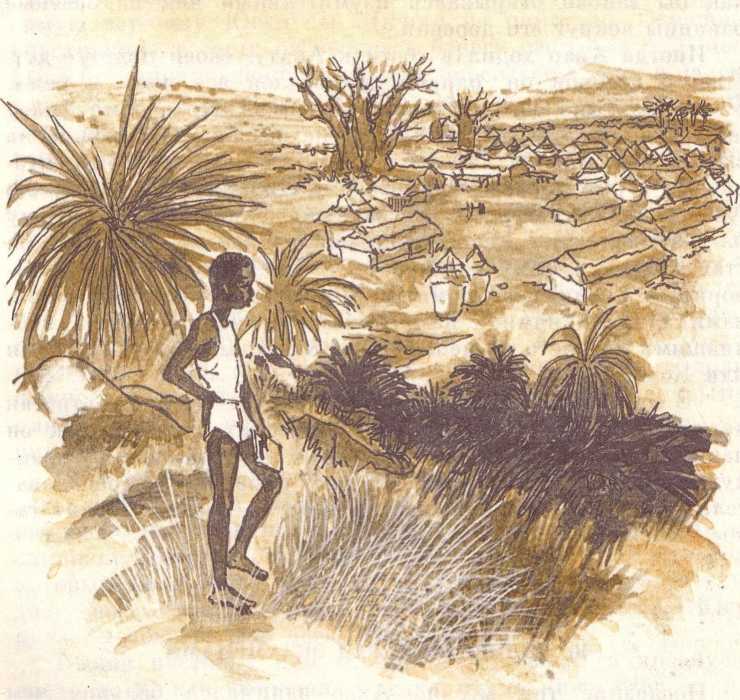 В длинной набедренной повязке и в кофте, бабушка Сикиди, семидесятилетняя женщина среднего роста, крепкая, стройная, как и большинство африканок, шла позади ребятишек. Грудь ее, вскормившая многих детей, казалась под кофтой совсем плоской. На голове нам Сикиди белел, повязанный наподобие тюрбана, платок, из-под которого выбивались мелко вьющиеся седеющие пряди волос.