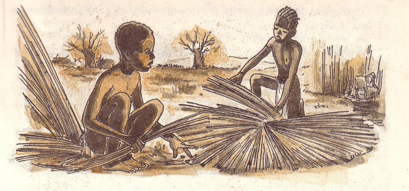 Анату, с самым серьезным видом, неторопливо, показала, как надо класть тростник веером, чтобы головки его оказались в центре и лежали, почти касаясь друг друга. Айао слушал и внимательно следил за ней. Но когда он взялся за работу сам, то у него ничего не получилось: он упал, а весь тростник разлетелся в разные стороны.