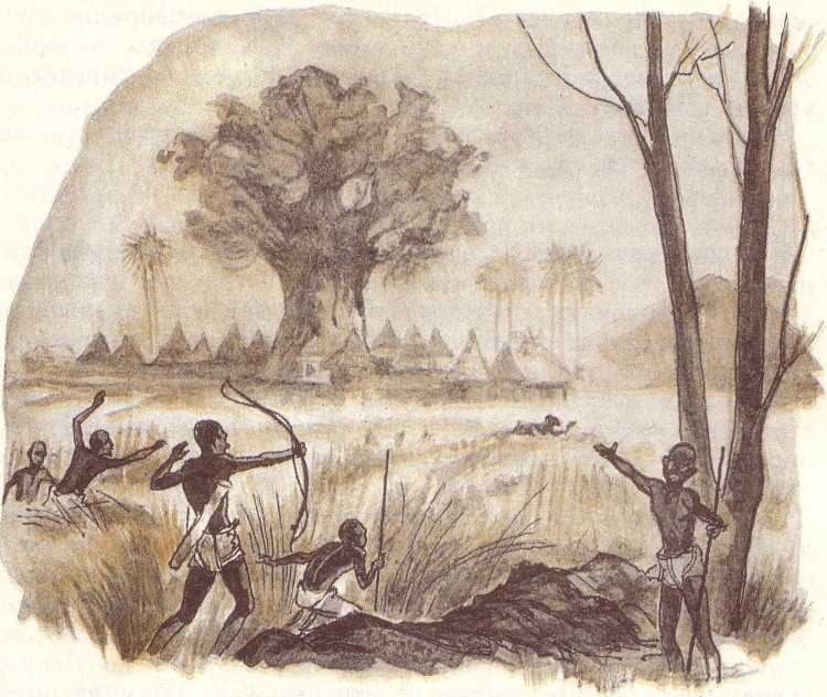 Вдруг Киланко осенила мысль, как покончить со всей этой муравьиной армией. Огонь в очаге, сложенном из четырех камней, на котором целый день варили масло из плодов масличной пальмы, уже давно потух. Но под большим котлом, наполненным красноватой жидкостью, еще теплился пепел. Он-то и привлек внимание Киланко. Затянув покрепче свою пань, Киланко быстрым движением выхватил из очага пепел и высыпал его на порог хижины. Среди муравьев началась настоящая паника. Послышался хруст загоревшихся насекомых. Дорога им была отрезана, и они больше не ползли в хижину. Тогда Киланко решил покончить с остальными. Он высыпал на пол еще несколько совков горячего пепла, и еще одна партия муравьев мгновенно истлела.