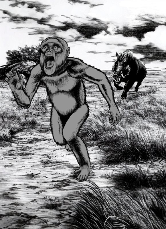 Конечно, этим не могли не воспользоваться другие птицы. Когда мы подросли, мы просто стали интересны более крупным хищникам. На черепе детёныша южноафриканского австралопитека «бэби из Таунга» сохранились красноречивые следы клюва беркута. А сам череп с причленённой нижней челюстью, расклёванными глазницами и разрушенным темечком точь-в-точь походит на черепа мартышек и даманов, валяющихся под гнёздами современных африканских орлов. Всякий жалующийся на тяжёлую судьбину должен иногда вспоминать о временах, когда мы были добычей даже для орлов.